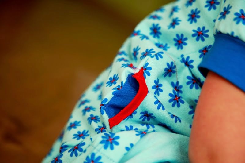 die ik afwerkte met elastische biais en met rode stikzijde stikte ik de zakken door.